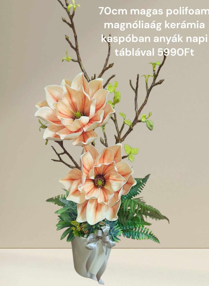 70 cm magas barack színű, polifoam magnólia ág, kerámia kaspóban